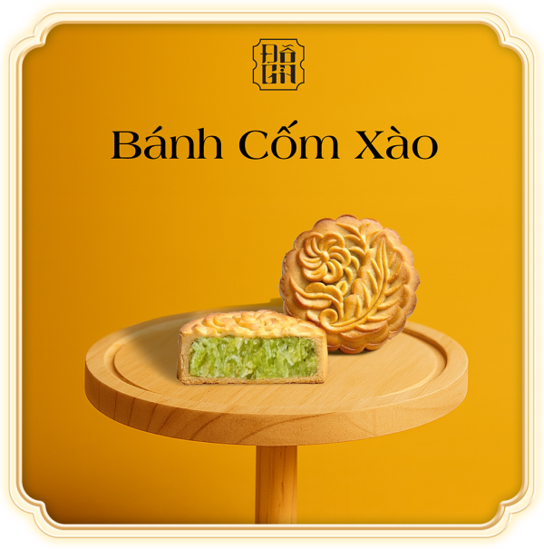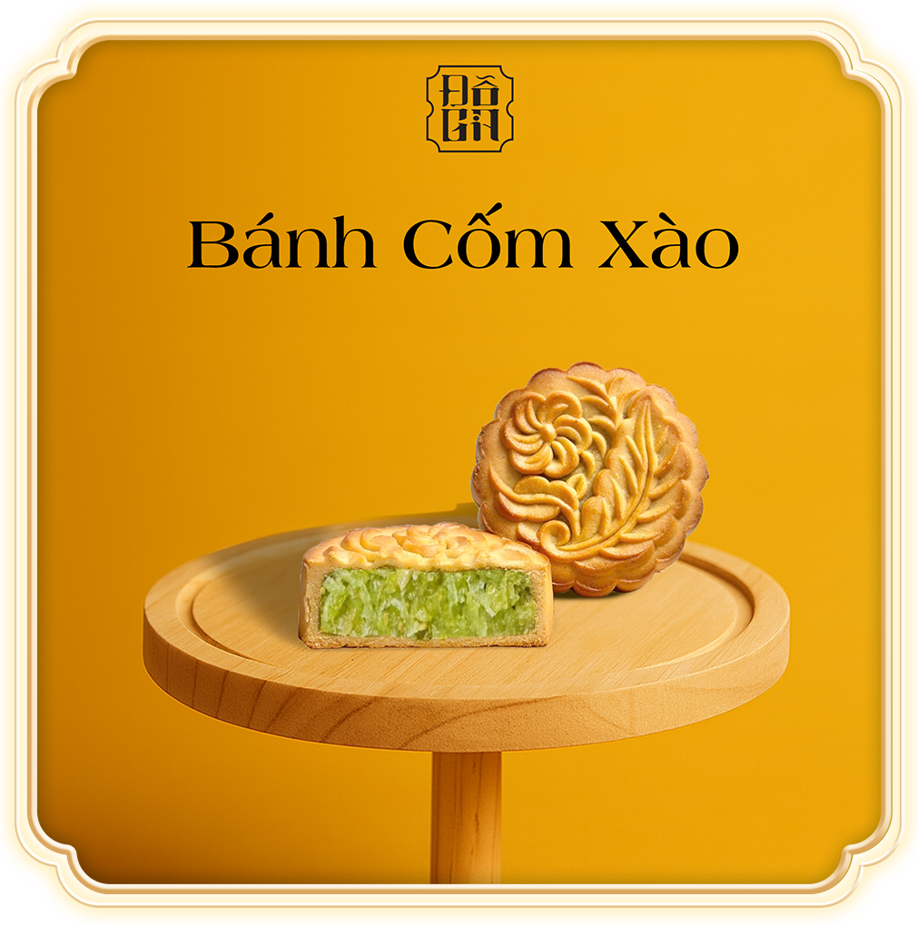 Bánh trung thu Cốm Xào của Đỗ Gia – Quà Tặng Phố Xưa mang hương vị tinh hoa Hà Nội. Nhân cốm dẻo thơm được xào khéo léo, kết hợp lớp vỏ bánh nướng vàng óng, tạo nên chiếc bánh trung thu thanh tao, đặc trưng của mùa thu.