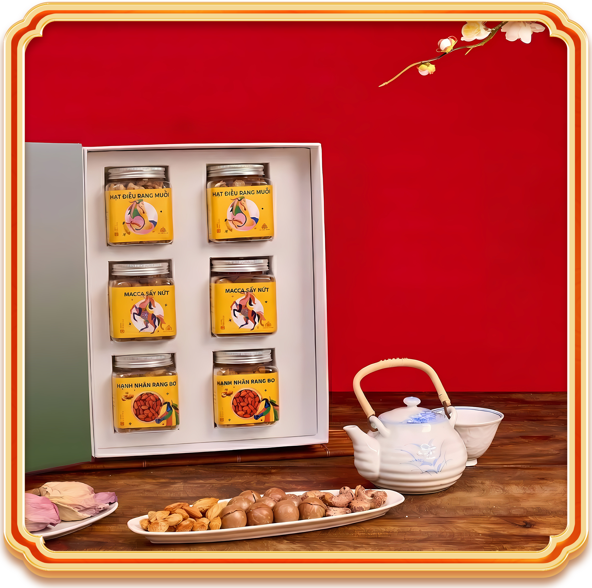 Set Ngũ Lộc Trao Xuân cho phép tùy chỉnh linh hoạt để sát nhu cầu thực tế. Bạn có thể hoán đổi hũ hạt dẻ cười sang hũ hạt điều nếu muốn tối ưu ngân sách, hoặc thay hũ hồng sấy dẻo bằng hũ mơ sấy dẻo nếu gia đình ưa vị chua thanh hơn. Phần trà có thể nâng cấp theo gu uống, vẫn giữ tinh thần trà thảo mộc nhưng thay đổi cấp độ hương để phù hợp người lớn tuổi hay nhóm bạn trẻ.