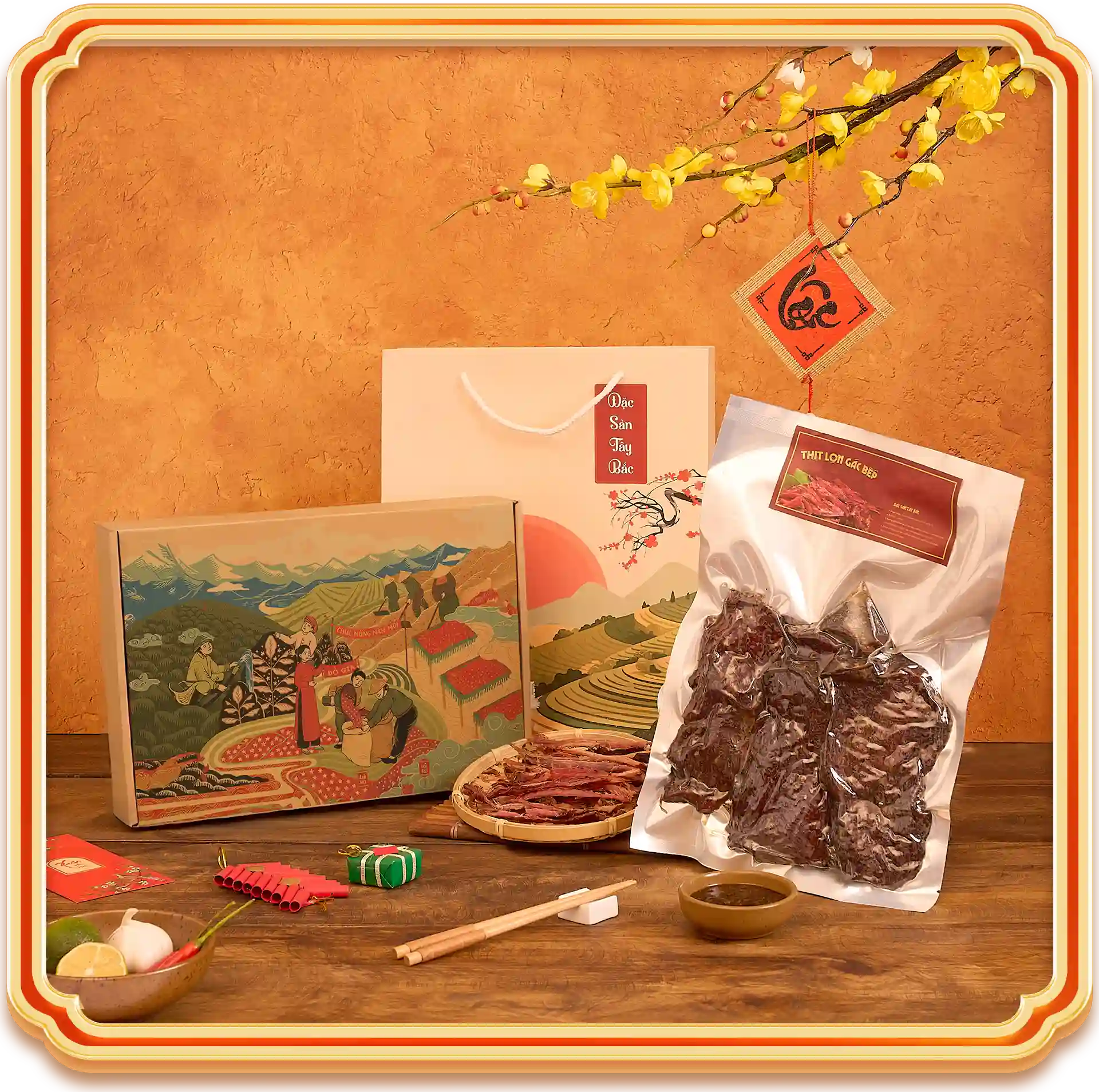 Set Quà Bản đặt trọng tâm vào cảm xúc “quây quần bàn ăn” của những ngày đầu năm. Hương khói đặc trưng từ thịt gác bếp gợi về gian bếp ấm, bữa nhâm nhi thân tình và câu chuyện mùa vụ miền núi. Khi trao tặng, bạn không chỉ gửi một hộp quà Tết mà còn trao một lát cắt văn hóa ẩm thực, một lời chúc sung túc và đủ đầy. Chính vì vậy, Quà Bản phù hợp xuất hiện trong danh mục quà Tết dành cho người thân, đối tác lâu năm hoặc khách hàng thân thiết—những người bạn muốn tạo ấn tượng khó quên ngay từ lần mở nắp đầu tiên.