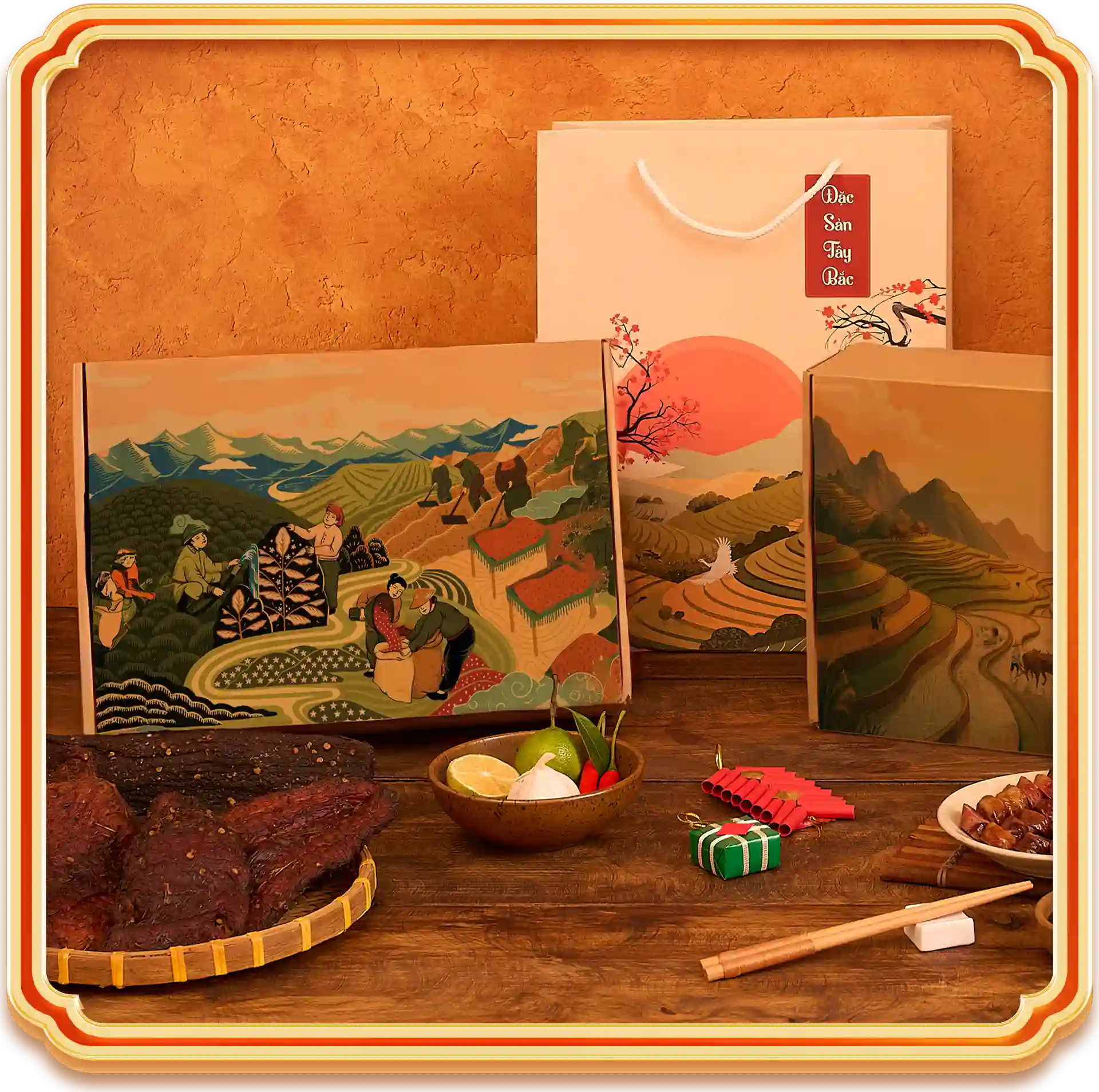 Phần họa tiết lấy cảm hứng từ ruộng bậc thang và hình ảnh người dân lao động—những biểu tượng đặc trưng của vùng cao. Đường nét được tiết chế, phối màu trầm ấm để phù hợp không khí Tết và nhiều không gian nội thất. Khi ánh sáng lướt qua, hiệu ứng in dập nhũ hoặc bế nổi (tùy phiên bản) giúp chi tiết nổi bật đủ để tạo điểm nhấn mà vẫn giữ vẻ thanh lịch. Tổng thể thiết kế hướng đến cảm giác “tôn vị bản địa trong khung hiện đại”, khiến hộp quà phù hợp cả khi làm quà tặng doanh nghiệp cho đối tác nước ngoài.