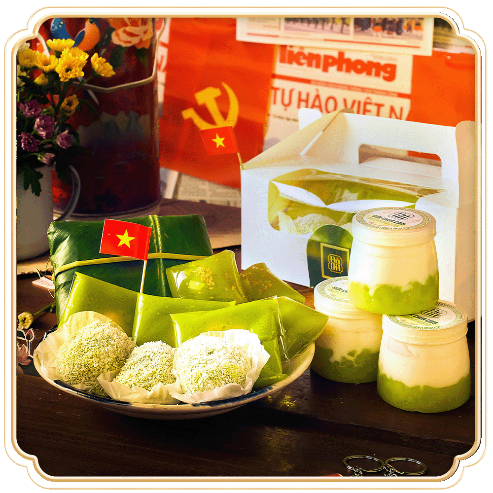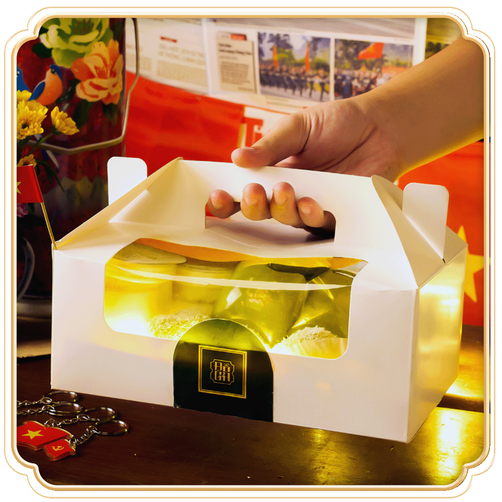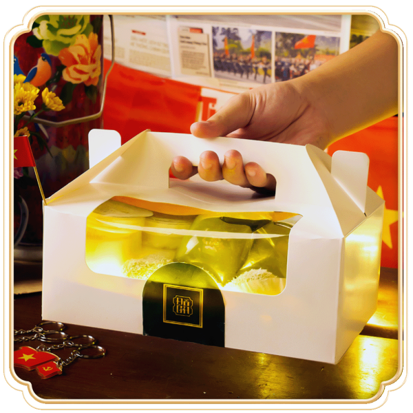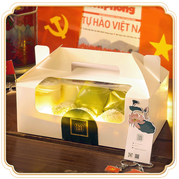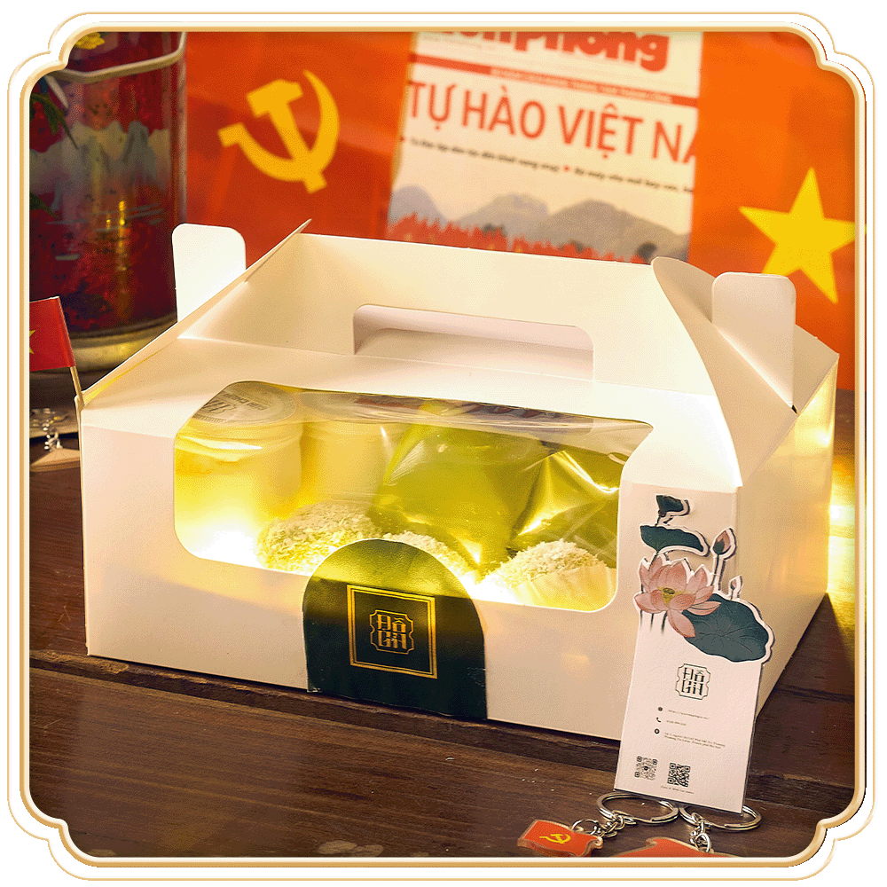 Quy cách: Hộp 5 loại sản phẩm (cốm, bánh cốm, mochi, xu xê, sữa chua cốm)